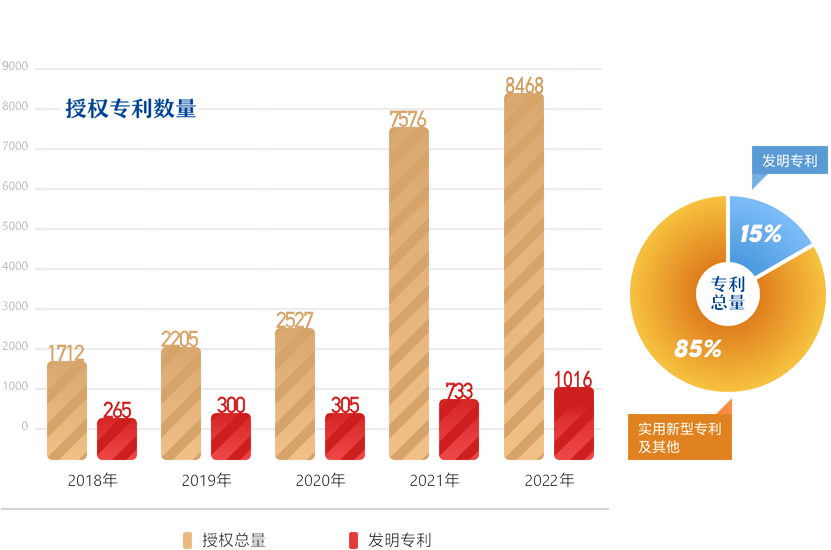 阻止2022年底,,,,,公司专利拥有总量30479件,,,,,其中:发明专利拥有总量4554件,,,,,高价值专利拥有总量2149件。。。。。。。。2022年度,,,,,公司获得专利授权量8468件,,,,,发明专利授权量1016件,,,,,PCT申请量99件,,,,,每万人专利拥有量1540件。。。。。。。。